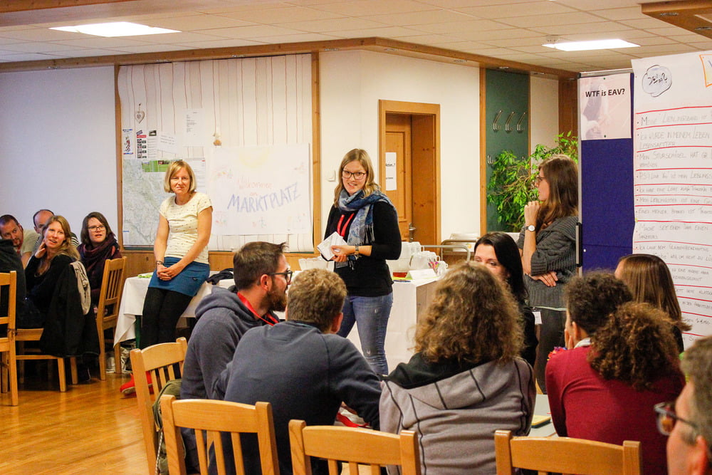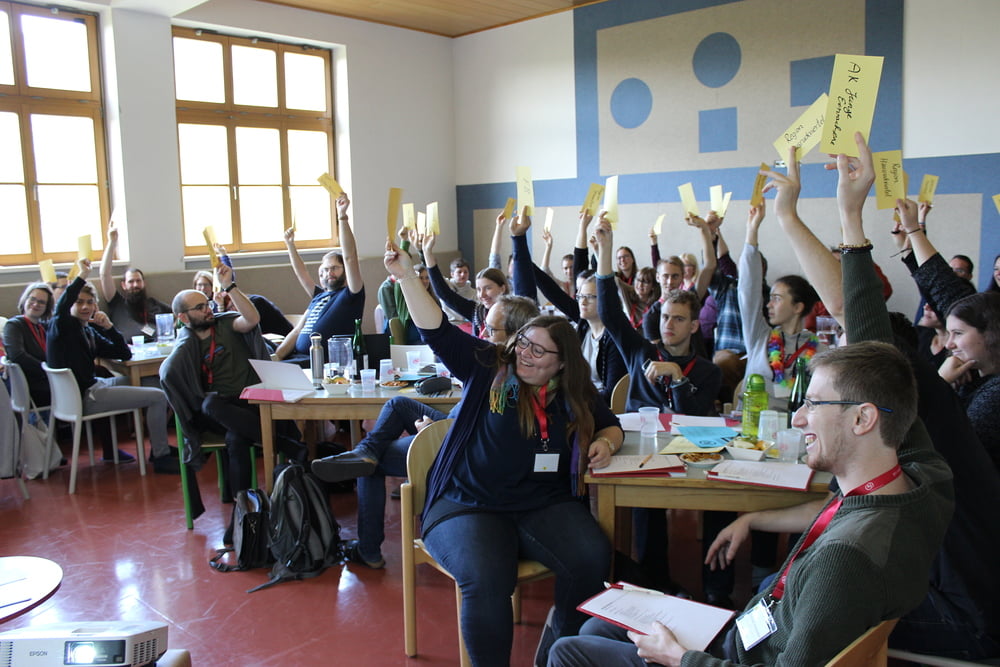 Danach treffen wir uns alle am Marktplatz, zu dem auch KA-Präsidentin Maria Hasibeder kommt, um sich mit der aktuellen Arbeit der kj vertraut zu machen. An verschieden Stationen können die Ehren- und Hauptamtlichen beispielsweise die Kandidaten für die Vorsitzenden-Wahl kennenlernen, ihren Wunsch für die neue Bundesregierung im Rahmen der Call for Change Kampagne niederschreiben oder sich über die nächsten Schritte auf dem Weg zum neuen Begegnungszentrum Leisenhof informieren. Für Plenum-Newbies werden an einem Tisch auch nochmal alle Abkürzungen und Begriffe des kj-Fachjagons spielerisch erklärt.