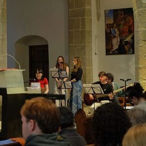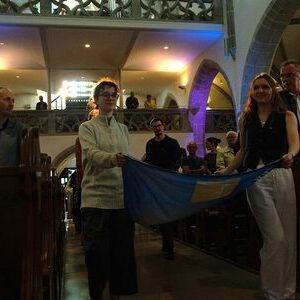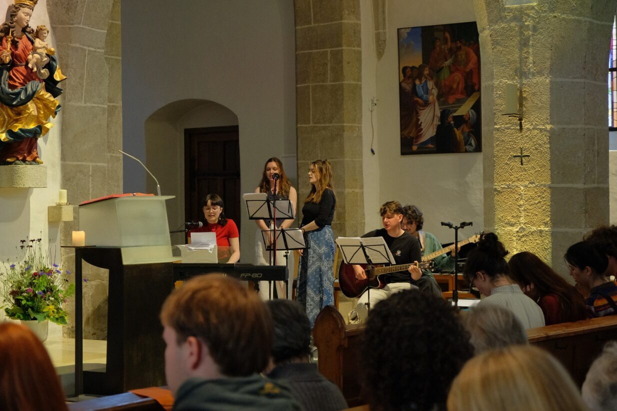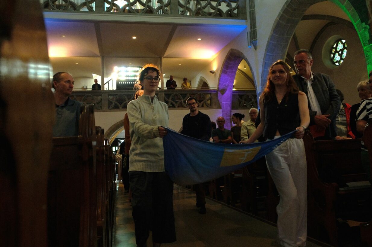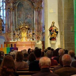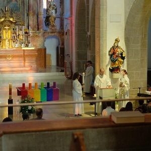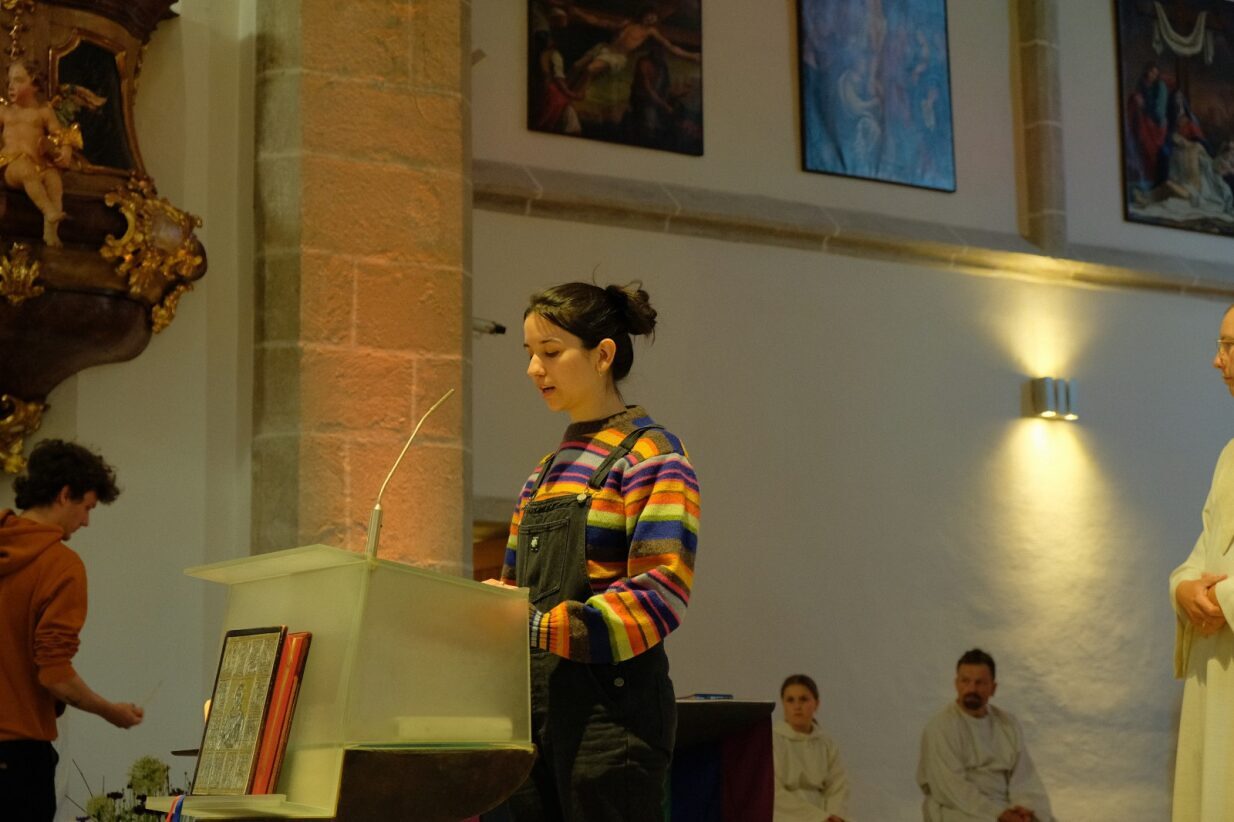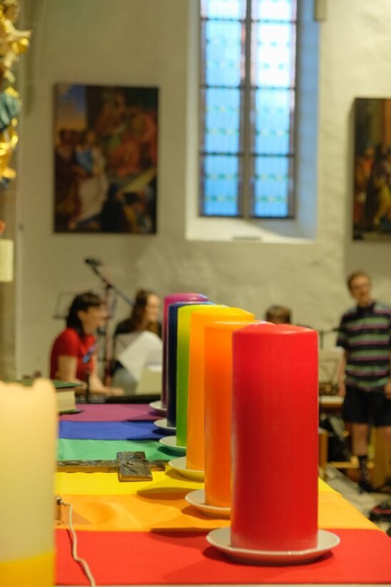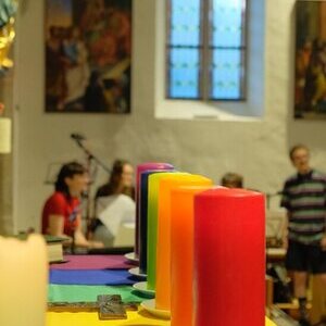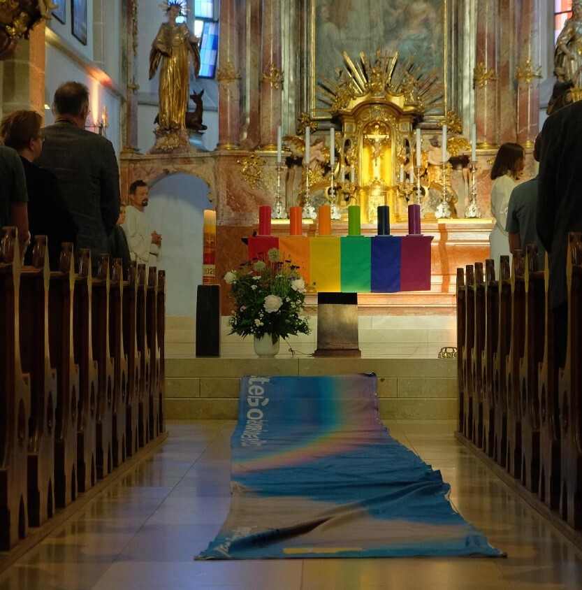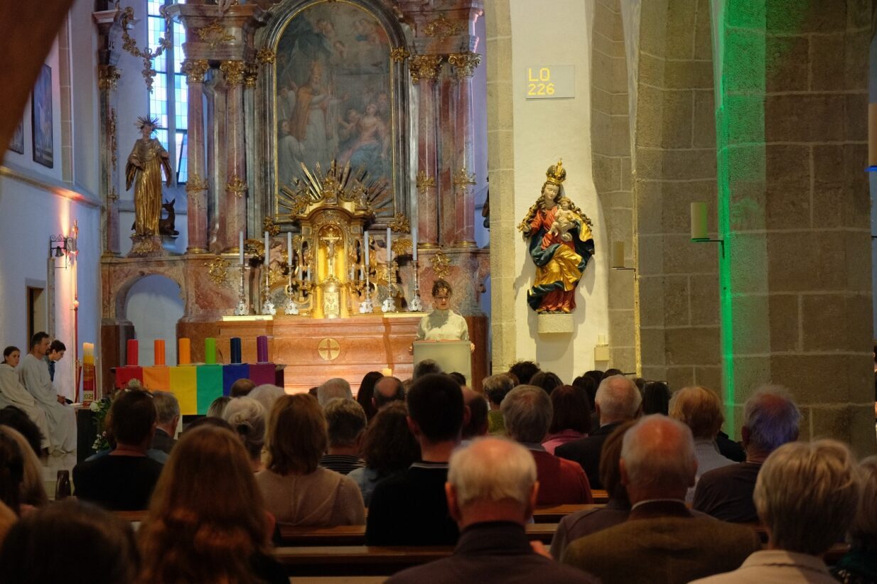 Das Regenbogenwochenende startete mit dem Samstagabendgottesdienst um 19:00 in der katholischen Pfarrkirche, welche bunt beleuchtet wurde. Der Einzug fand mit den Mitgliedern des Leitungskreises und den Ministrant*innen durch den großen Haupteingang statt. Gemeinsam wurde das großen Regenbogenpastoral - Transparent mit der Aufschrift „Unter Gottes Himmel haben alle Platz“ in die Kirche getragen und im Mittelgang abgelegt. Das Lied „Born this Way“ von Lady Gaga, welches Diversität und Selbstliebe feiert, wurde als Eröffnung von der hauseigenen KJ-Band gespielt.