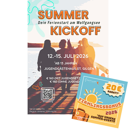 Von 12. Juli bis 15. Juli 2026 findet das Summer Kickoff am Wolfgangsee statt. Dabei handelt es sich um eine Jugendveranstaltung der Katholischen Jugend (Region unteres Mühlviertel) für Jugendliche ab 13 Jahren. Für 3 Nächte fahren wir nach St. Gilgen direkt an den Wolfgangsee mit rund 20 Jugendlichen und erleben was es heißt Gemeinschaft zu leben. Das Programm umfasst Kennenlern- und Teambuilding-Spiele, Sport- und Freizeitaktivitäten, verschiedene Workshops sowie spirituelle Impulse. Teilnehmer*innen, die im Jahr 2026 gefirmt werden, können den Firmlingsbonus einlösen und bekommen 20 € Rabatt.