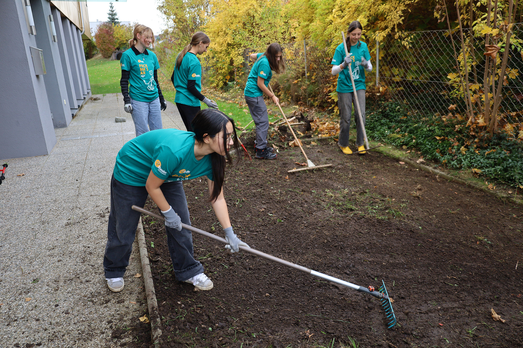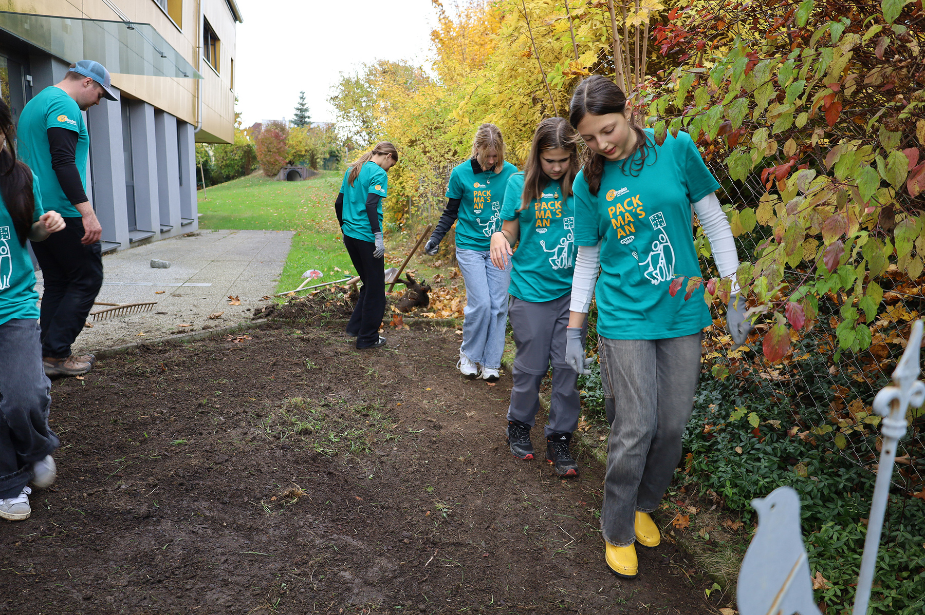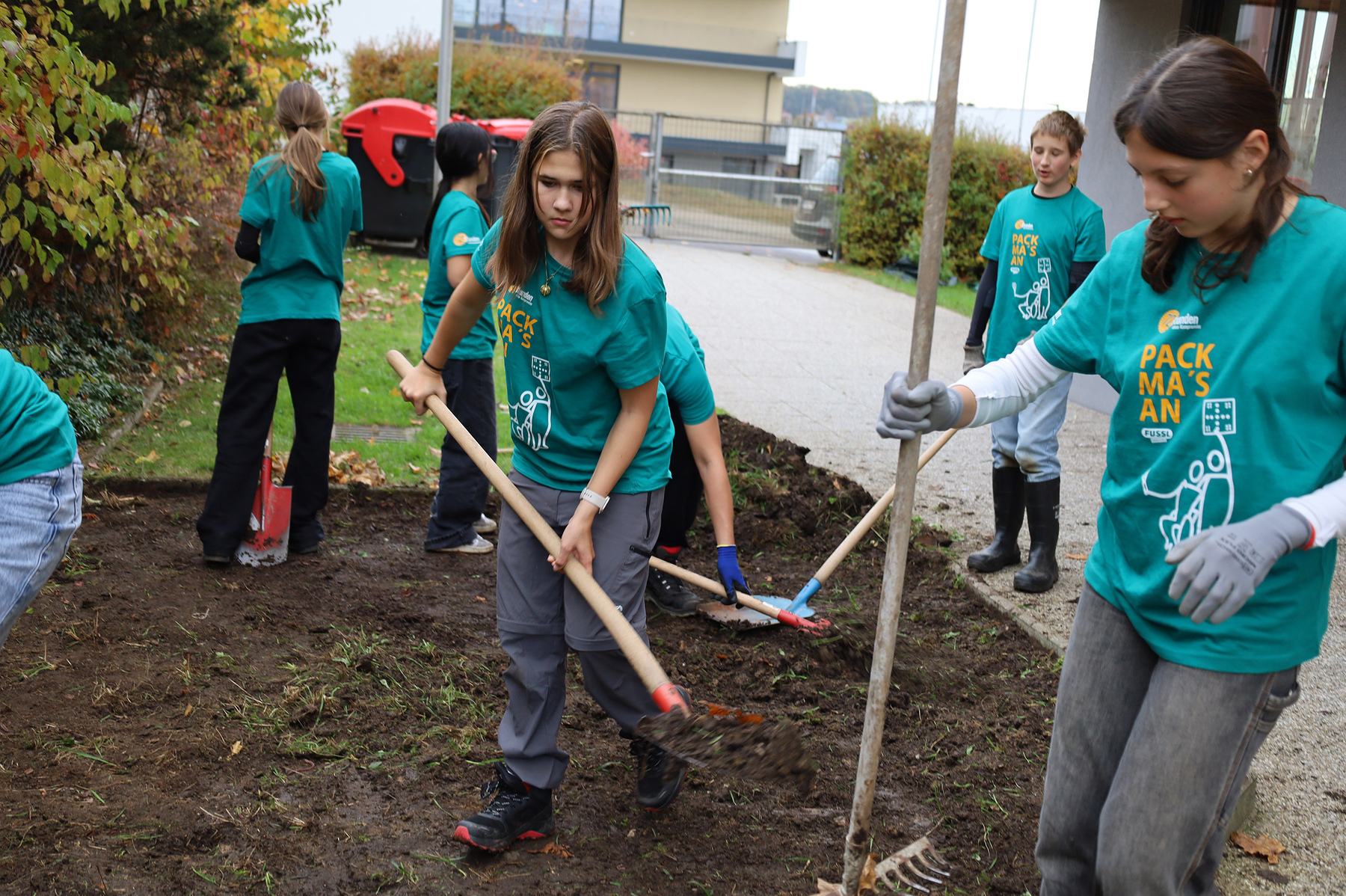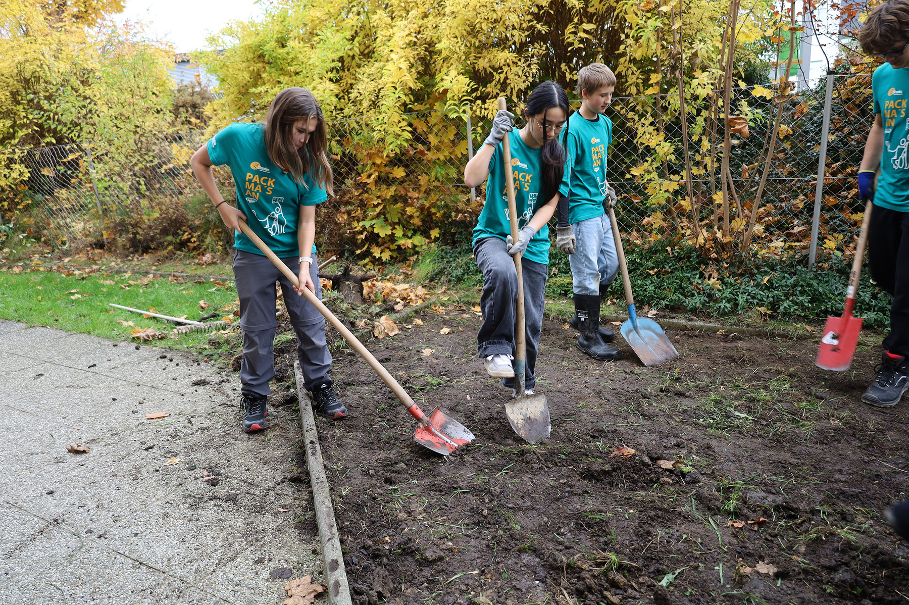 Die Jugendlichen hoben Erde aus, entfernten Wurzeln, legten die Rinne an und formten die Fläche mit viel Einsatz neu. „We already did a lot of work. The project is nearly done … but that’s no problem: we found new work. I really like the 72 Stunden. It's hard, but it is also fun. The small kids kind of helped us. They are so cute. We burnt the pasta, we worked harder than we thought, but we are having a good time“, erzählten Norah (14), Helena (13), Laura (14), Viola (14), Stella (13) und George (13).