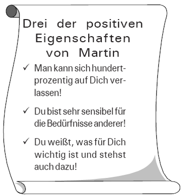 Alle GM verteilen sich so im Raum, dass keines das andere stört. Dann dreht es das Kärtchen um und schreibt auf die Rückseite drei positive Eigenschaften jenes GM, dessen Name auf dem Kärtchen steht. Abschließend werden die Kärtchen der Besitzerin persönlich übergeben.