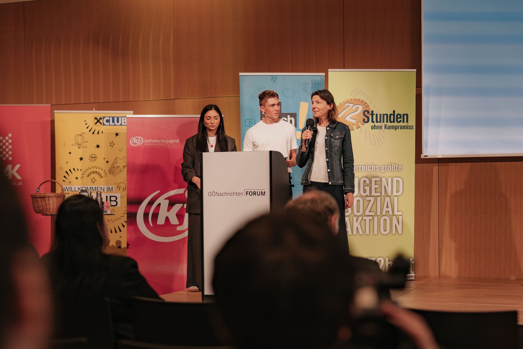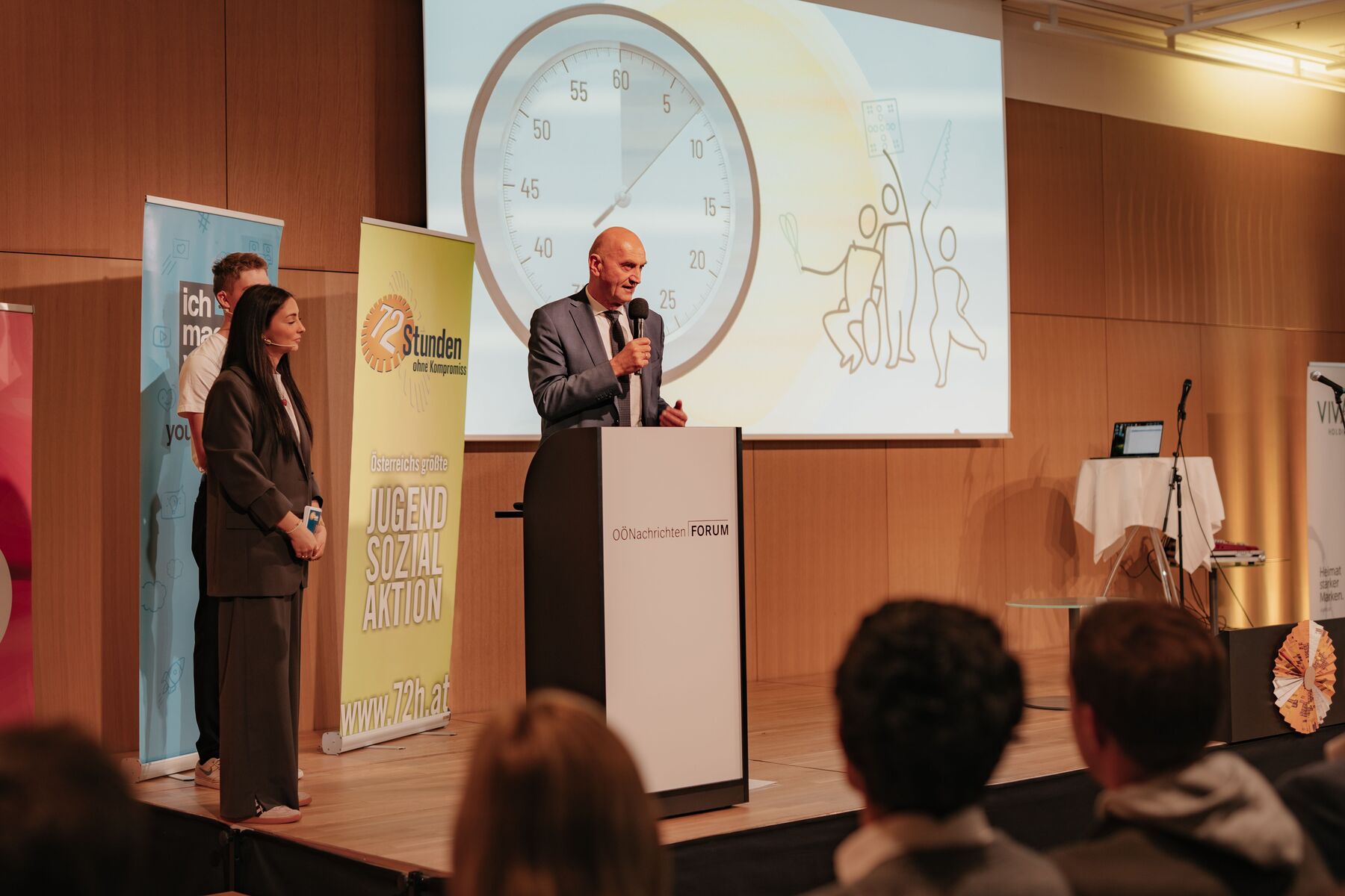 Philipp Hansa von Hitradio Ö3 wird in den kommenden 72 Stunden insgesamt acht Projekte in ganz Österreich besuchen. In Oberösterreich war er beim Startfest in Linz dabei und dankte den Jugendlichen für ihr Engagement: „72 Stunden ohne Kompromiss funktioniert nur mit euch – und dafür habt ihr Applaus verdient.“ Diesen kräftigen Applaus spendeten die Ehrengäste in der ersten Reihe, die sich zu den Jugendlichen umdrehten und ihre Wertschätzung für deren Engagement zum Ausdruck brachten.