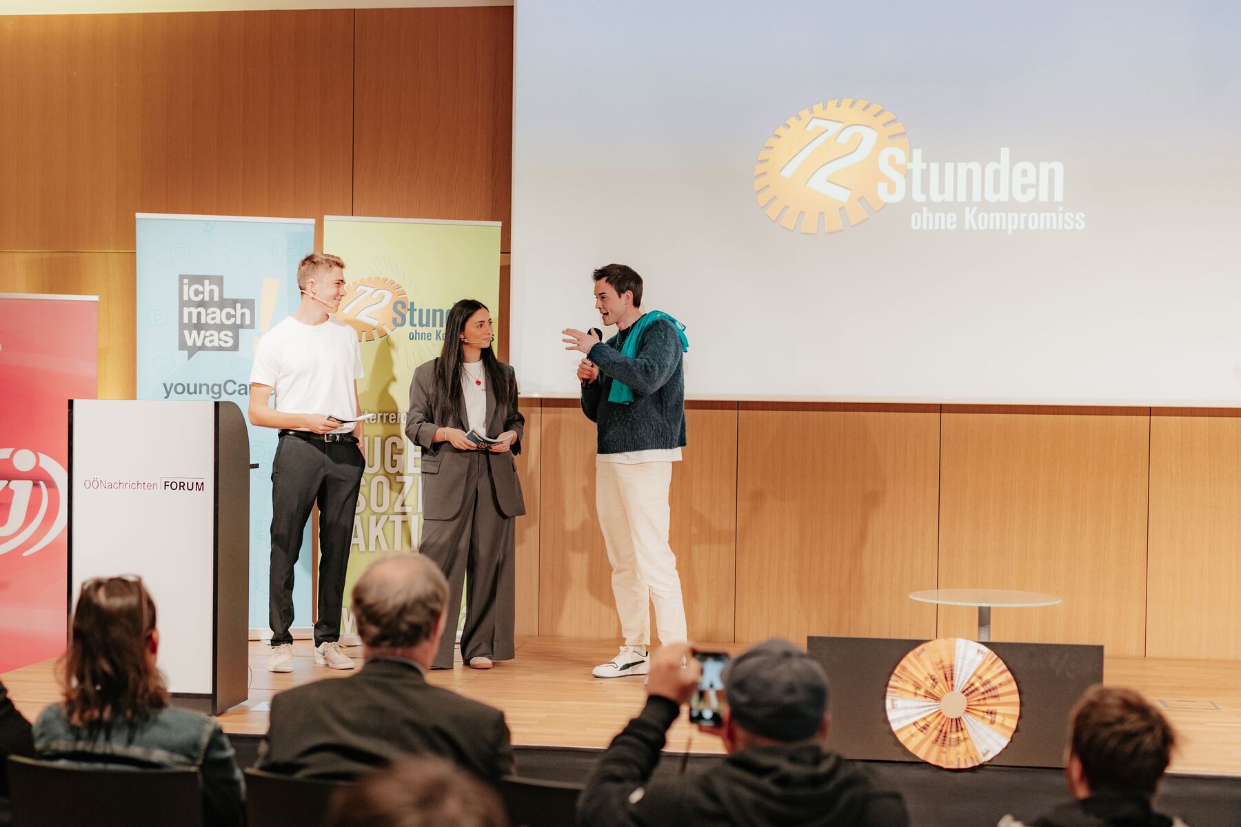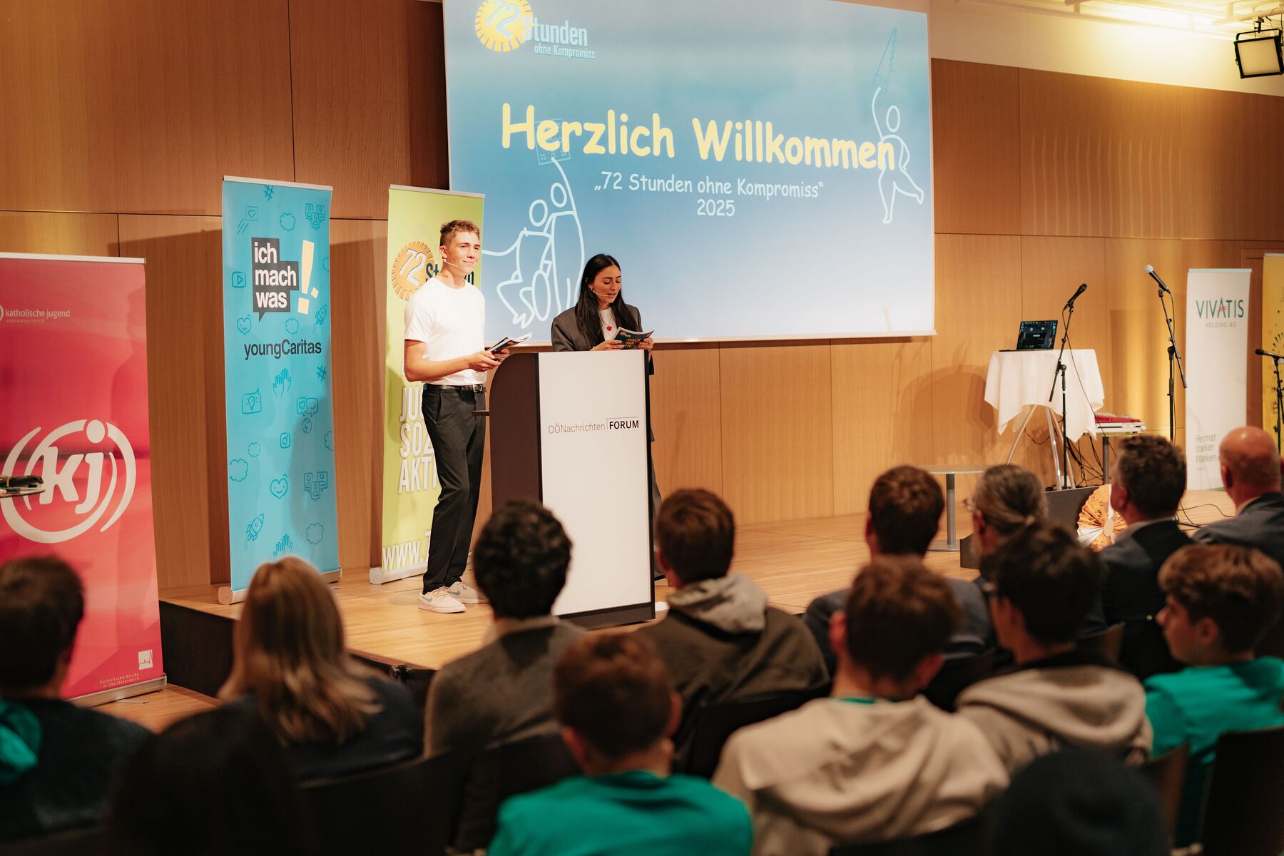 „Ich freue mich, dass ihr in den nächsten 72 Stunden zeigen werdet, wie engagiert Oberösterreich ist“, meinte Simon Mattle, ehemaliger Zivildiener der Katholischen Jugend, der mit Aline Huber von der youngCaritas OÖ den Auftakt moderierte, an die Jugendlichen gewandt. Für musikalischen Schwung sorgte die Band KGW3. Die Band und die Aktion „72 Stunden ohne Kompromiss“ verbindet ihr Einsatz für junge Menschen, Solidarität und gesellschaftliches Miteinander: Beide motivieren dazu, Verantwortung zu übernehmen, Vorurteile abzubauen und Begegnungen zwischen Generationen, Kulturen und Lebenswelten zu schaffen.