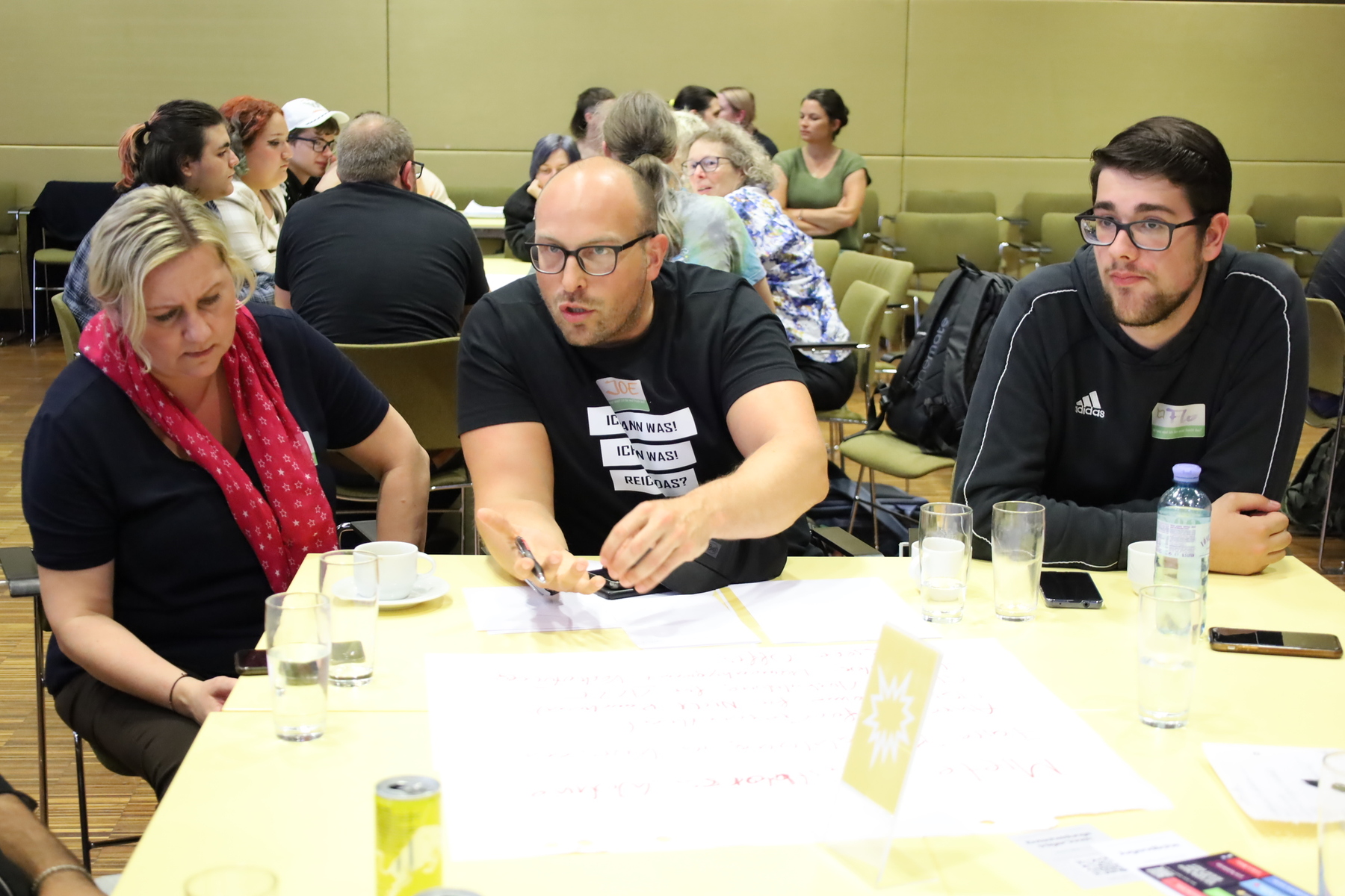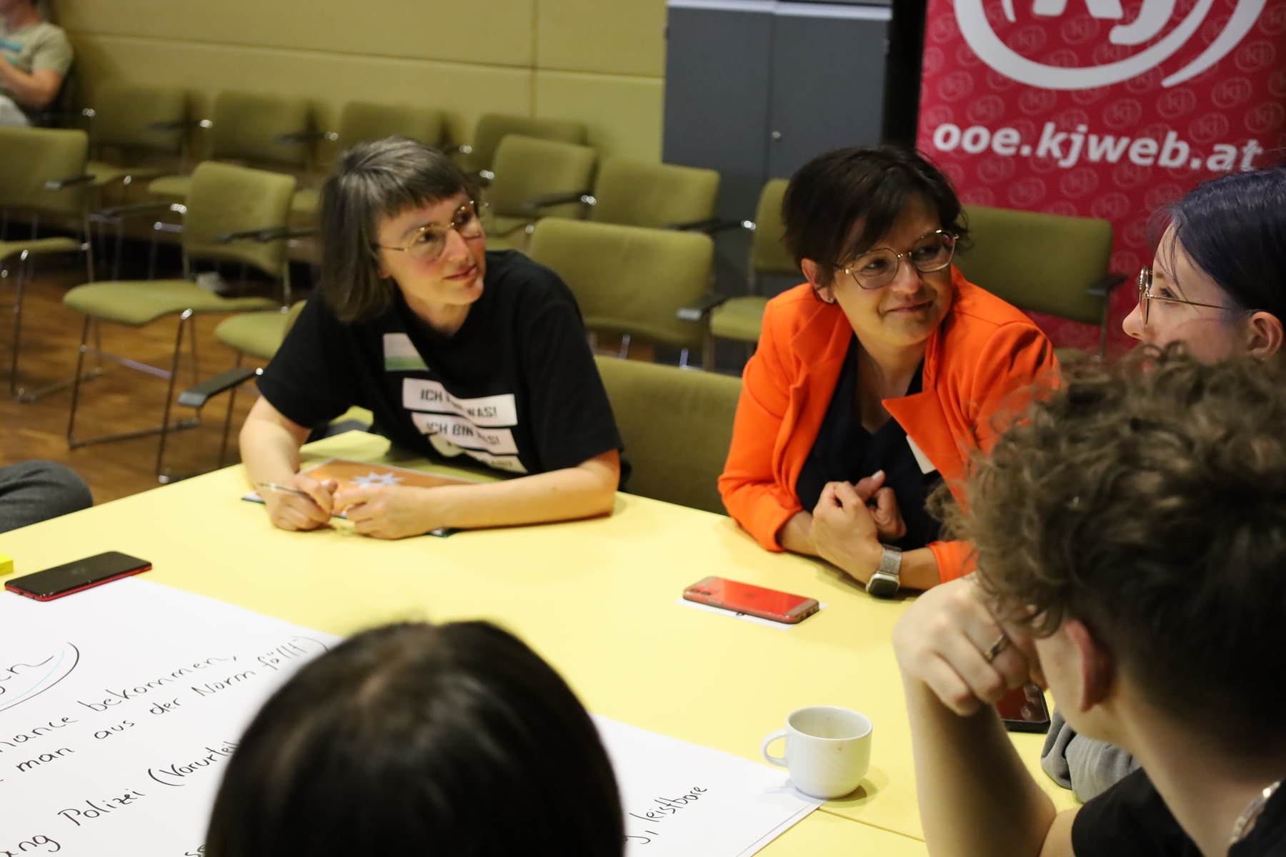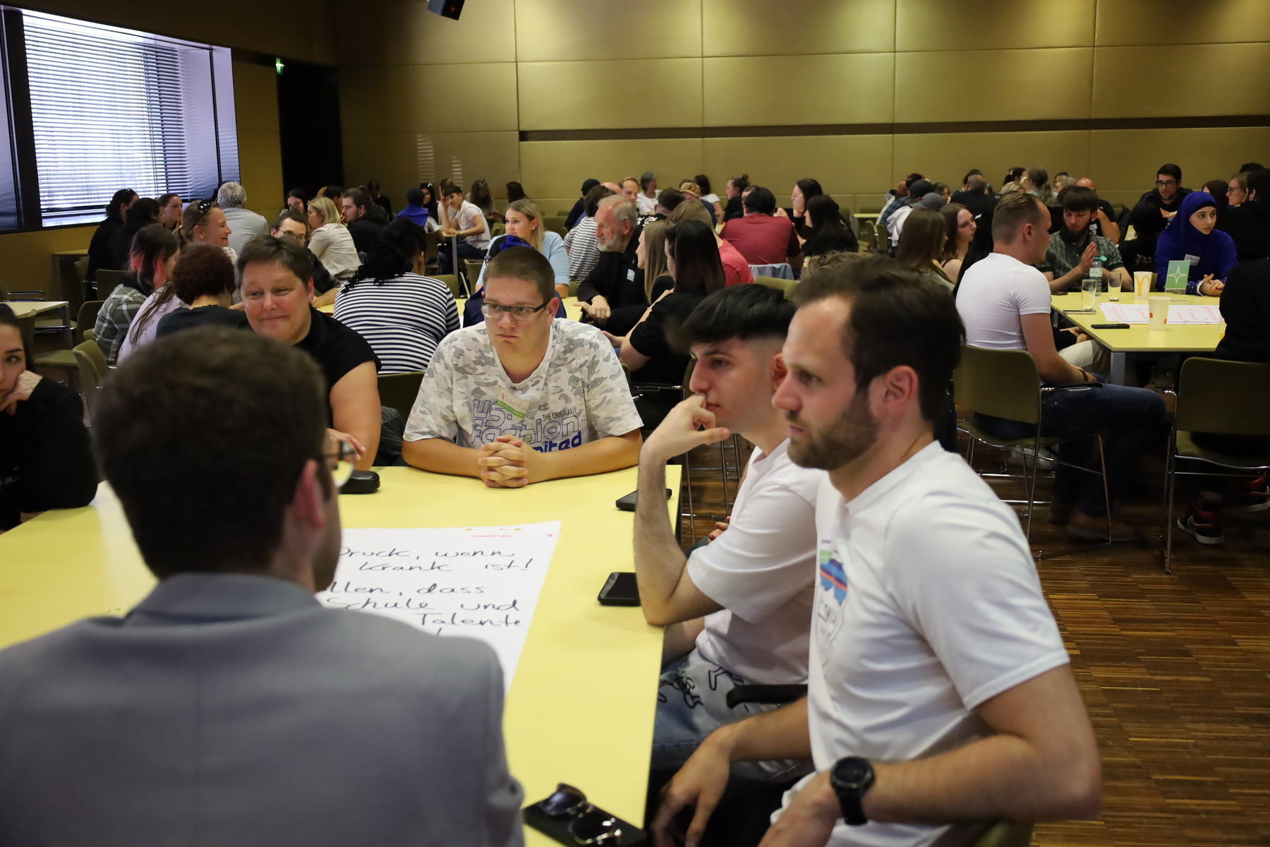 Im Anschluss daran bot sich den Teilnehmer*innen die Möglichkeit, in persönlichen Tischrunden direkt mit den Entscheidungsträger*innen in einen Dialog zu treten und ihre individuellen Anliegen zu äußern. Die Sorgen und Anliegen der Jugendlichen und die Standpunkte der Entscheidungsträger*innen wurden sorgfältig festgehalten