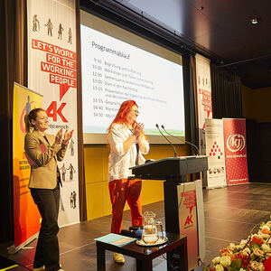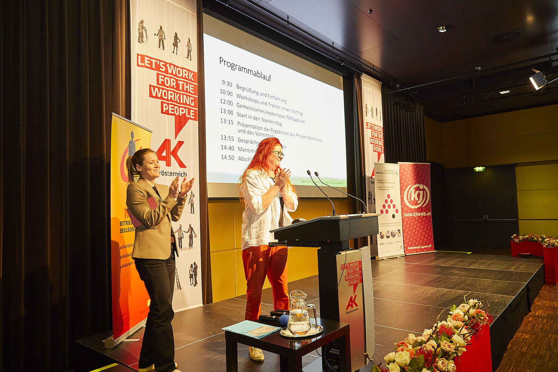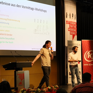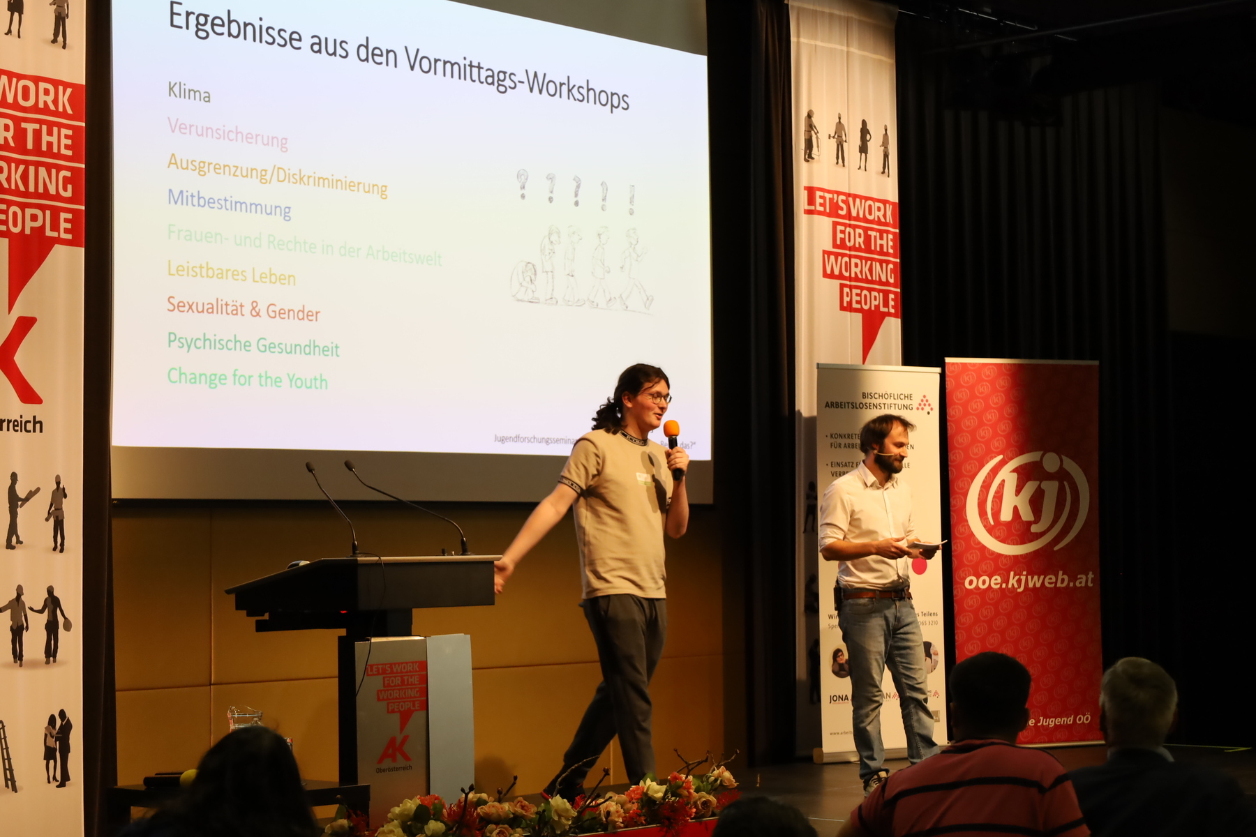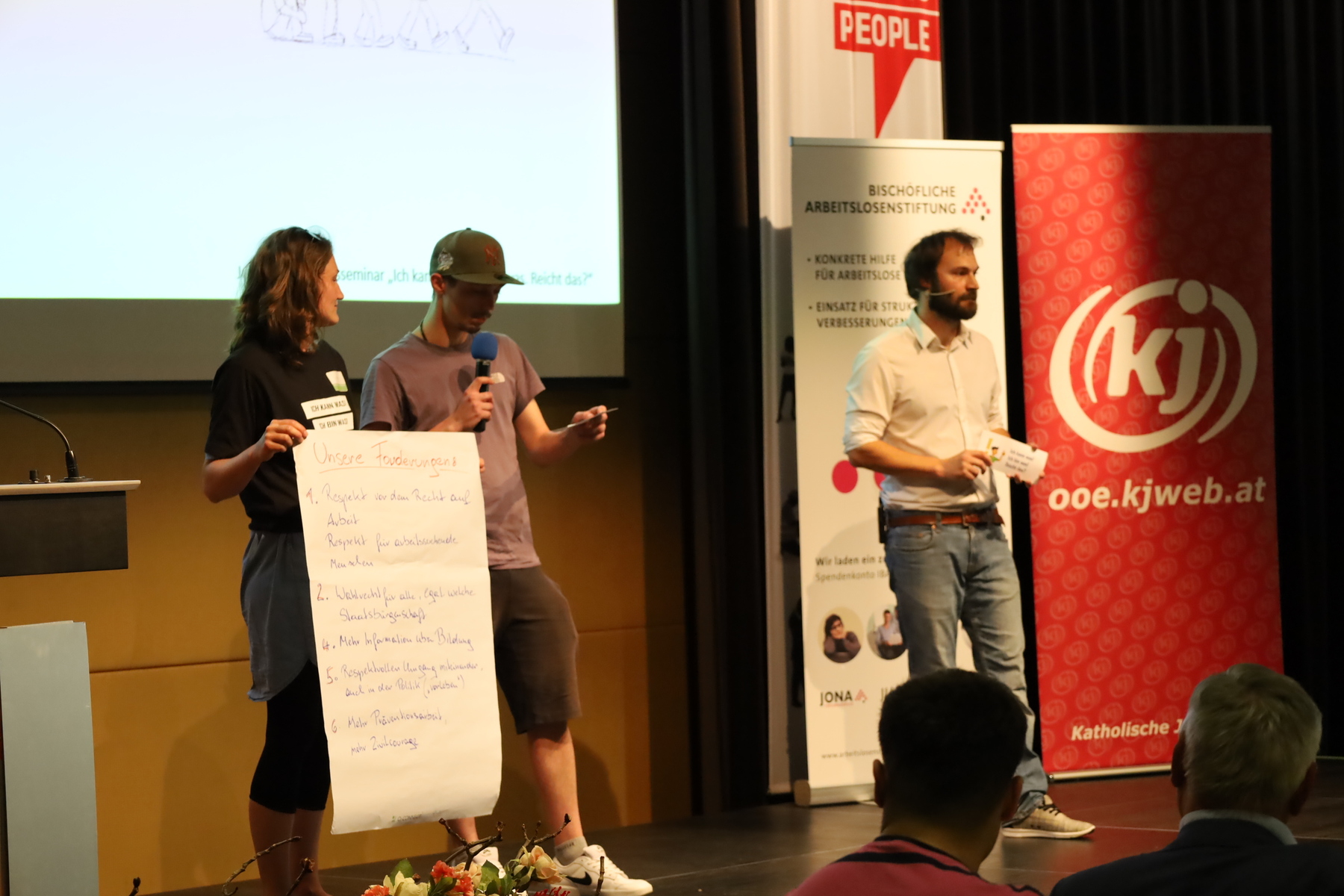 Am Nachmittag füllten die Jugendlichen gemeinsam mit den Entscheidungsträger*innen den Kongresssaal der Arbeiterkammer OÖ. Der Rapper Grandmaster Flow eröffnete den Nachmittag mit einem eigens für die Jugendlichen komponierten Rap-Song, der die zuvor gesammelten Anliegen aufgriff. Anschließend präsentierten die jungen Menschen ihre Anliegen und Forderungen. Hier wurde Klartext geredet, Träume wurden ausgesprochen und Visionen wurden diskutiert.