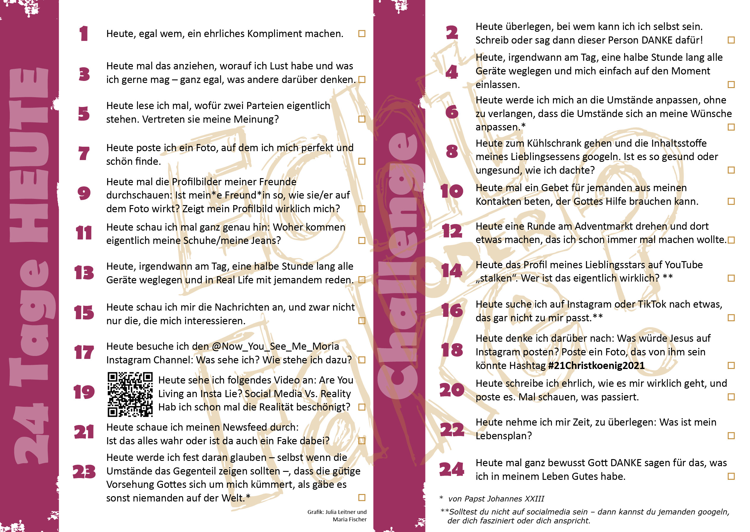 Wie wir auf dieses Thema kommen? Ganz einfach: Wir haben uns die Bibelstellen des Christkönigssonntags durchgelesen und diesen Aspekt aus dem Evangelium herausgegriff en. In der Bibelstelle wird Jesus von Pontius Pilatus verhört. In diesem Verhör fragt Pilatus ganz direkt und off en Jesus, ob er denn wirklich der König der Juden sei. Er hat nachgefragt und sich selbst eine Meinung gebildet. Pilatus hat die Behauptungen der religiösen Vertreter gehört, aber er wollte auch hören, was Jesus dazu zu sagen hat. Und Jesus hat ihm die Wahrheit gesagt, im Bewusstsein, dafür zu sterben.
