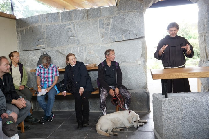 Nach einem Fußmarsch mit Regen und Sonnenschein im Shalomkloster Pupping angelangt, begrüßt Pater Fritz Wenigwieser die Gäste und führt sie in die neu errichtete Franz Jägerstätter- Kapelle.