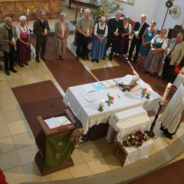 16 Ehepaare feierten am Sonntag ihr Ehejubiläum. Nach dem Einzug in die Kirche, begleitet vom Bläserquartett, fand der Gottesdienst statt. P. Christian Mair feierte mit der Pfarrgemeinde und segnete die Paare. Auch die musikalische Gestaltung war abwechslungsreich und stimmig. Nach der Messe wurden die Ehepaare zur Agape und zum Frühschoppen in den Kaplanstock eingeladen. Die Flachberger Musi sorgte für die musikalische Umrahmung. Es war ein runderhum schönes Fest.